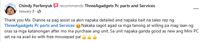 Thank you Ms. Dianne sa pag assist sa akin napaka detailed and napaka bait na sales rep ng ThreeAgadgets Pc parts and Services Nakaka sagot agad sa mga tanong at willing pa mag laan ng oras sa mga katanongan after mo ma purchase ang unit. Sa unit napaka ganda good as new ang Mini PC set na na avail ko with free mousepad pa!